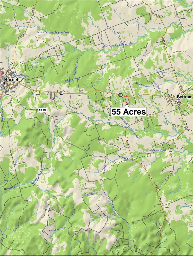 55 acres of unrestricted land located on Hwy. 29 just west of Bertram. This well shaped tract is flat and covered with mature oak trees. There are a number of potential uses for this property including commercial, residential, or multi-use. Situated in one of the fastest growing stretches of highway in the Austin area (the Hwy. 29 corridor between Liberty Hill and Burnet), this property offers significant investment upside. 12 miles to Liberty Hill and within 45 minutes of downtown Austin. Property Summary SheetLOCATION: Hwy. 29 just west of Bertram SIZE: 55 acres