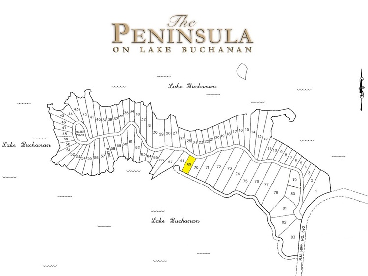 One of the last unspoiled stretches of lake front property in all of Texas awaits your dream home or retirement retreat. Boasting over two miles of shoreline, which varies from gently sloping sandy beaches to dramatic granite boulders disappearing into the deep blue waters of Lake Buchanan, The Peninsula provides the best of lakefront living. With sweeping views of the largest lake of the Hill Country and sunsets from your back deck, this is a land to be cherished forever, and passed on as a family legacy. Property Summary SheetLOCATION: The Peninsula on Lake Buchanan, Lot 69 SIZE: 0.90 acres