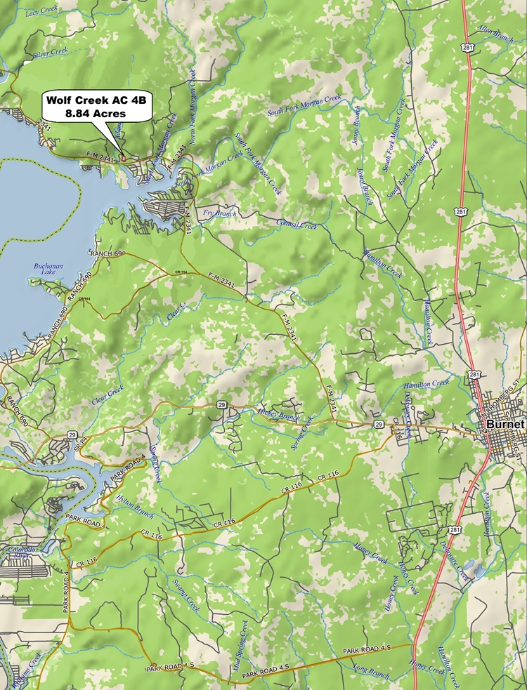 Wolf Creek Ranch is a 1320 acre ranch development with gated entry and 120 acres of common reserve area which includes a pavilion alongside North Morgan Creek and a day dock on Lake Buchanan. This nine acre home site overlooking Lake Buchanan offers amazing hill country views. Property Summary SheetLOCATION: Wolf Creek Ranch lot AC 4B SIZE: 8.84 Acres